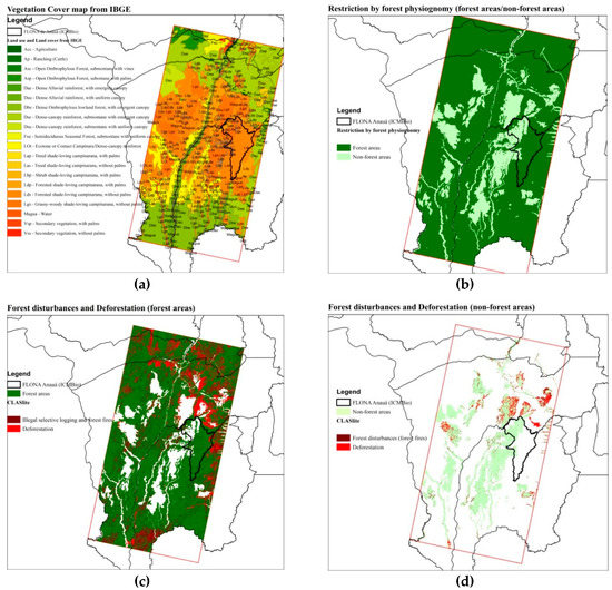 Restriction by forest physiognomy (forest area/non-forest area) derived from the vegetation cover map from IBGE to perform the overlapping of CLASlite results: (a) Cover map from IBGE; (b) Restriction by forest phytophysiognomy (forest areas/non-forest areas); (c) Overlapping of CLASlite results in forest areas: forest disturbances and deforestation; (d) Overlapping of CLASlite results in non-forest areas: forests disturbances and deforestation.