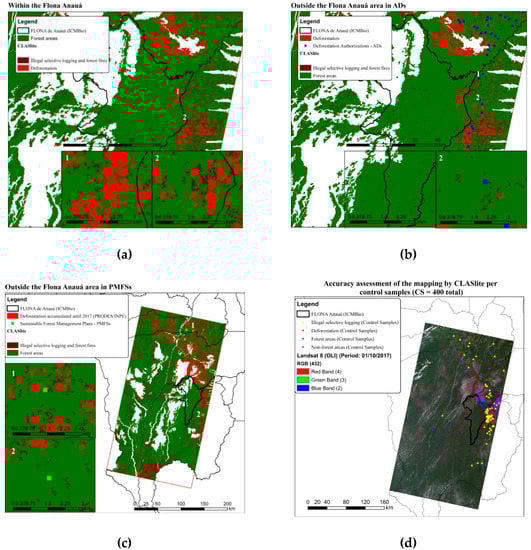 Analysis of the spatial pattern of illegal selective logging in the northern Brazilian Amazon: (a) Within the Flona Anauá; (b) Outside the Flona Anauá area in deforestation authorizations (ADs); (c) Outside the Flona Anauá area in Sustainable Forest Management Plans (PMFSs); (d) Accuracy assessment of the mapping performed by CLASlite per CS (Landsat 8/OLI; Period: 10 January 2017).