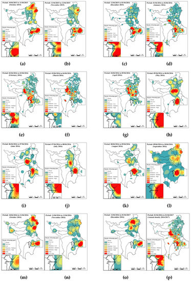 Monthly estimates and annual density of forest fires in the State of Roraima: (a) October 2015; (b) November 2015; (c) December 2015; (d) January 2016; (e) February 2016; (f) March 2016; (g) April 2016; (h) May 2016; (i) June 2016; (j) July 2016; (k) August 2016; (l) September 2016; (m) October 2016; (n) November 2016; (o) December 2016; (p) Annual density, 2016/2017. Burning spots were obtained from the program INPE/Queimadas (http://www.inpe.br/queimadas/portal).