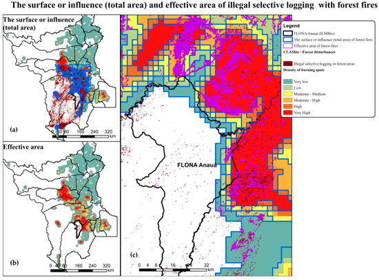 Mapping the surface area or influence (total area) and the effective area of illegal selective logging with forest fires in southern Roraima, thereby combining the information generated by CLASlite with INPE/Queimadas: (a) The surface area or influence (kernel density—burning spots; spatial resolution of 2472 m); (b) Effective area (spatial resolution of 30 m); (c) The surface area or influence, and the effective area within and outside Flona Anauá.