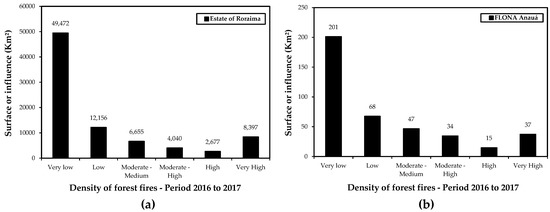 The surface area, or influence of forest fires of very high density (8,397 km²) were detected in the south-central region of Roraima during 2016 and 2017 (Figure 11a). The eastern region of Flona Anauá experienced a very high density of forest fires (37 km²) (Figure 11b), while the south-central region was the most affected by fires in Roraima (2016 and 2017) (Figure 12). The effective area of the forest fires was in 772 km² (1.2%) of the mosaic area, and 8 km² (0.3%) within Flona Anauá.