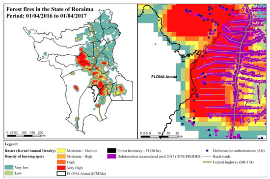 We identified the locations of fires on a monthly basis (burning spots = 76,018) by using the program INPE/Queimadas [38] for the State of Roraima (area: 224,300.8 km²; period: Period: 04 October 2015 to 04 January 2017; and satellites Aqua and, Terra, GOES-13, NOAA-15, NOAA-18, NOAA-19, NPP) for generating the annual kernel density map after several tests (burning spots = 68,296; Period: 04 January 2016 to 04 January 2017; cell size: 0.02 (6.25 km²); search radius: 0.1; mask: State of Roraima; satellites: Aqua, Terra, GOES-13, NOAA-15, NOAA-18, NOAA-19, NPP), and to determine the surface area or influence (total area) of forests fires (Figure 9).