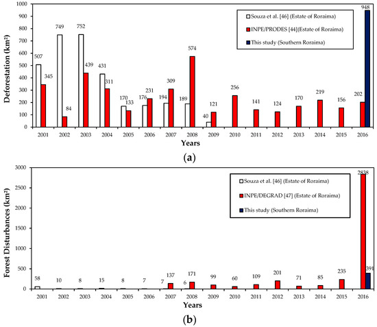 Annual rates for deforestation and forest disturbances for the State of Roraima: (a) Deforestation from Souza et al. [46] (2001 to 2010), INPE/PRODES [44] (2001 to 2016), and the present study (2016); (b) Forest disturbances from Souza et al. [46] (2001 to 2010), INPE/DEGRAD [47] (2007 to 2016), and the present study (2016).