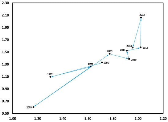 Detrended correspondence analysis (DCA) for herbaceous layer communities from 1991 to 2014 on reference watershed WS4. Data points shown along with years are centroids (two-dimensional means) for each year.