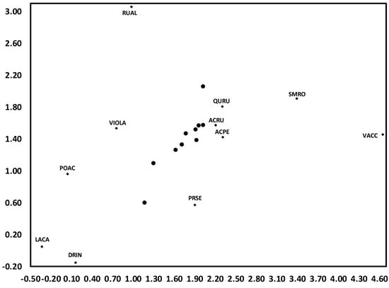 Differences between results of DCA on temporal trends of herb composition WS4 and those of WS3 suggest the profound effects of experimental additions of N on herb layer dynamics. Although there was minimal variation along Axis 1 during the initial period of the study (1991–1994), there was a substantial shift in composition from 1994 to 2003, one which never returned toward the initial period, as was observed for WS4 (Figure 3). Similar to WS4, species variation along this time trend on WS3 occurred across two gradients. The first suggests a disturbance gradient, from S. rotundifolia, often associated with canopy disturbances [39], to fern species (Polystichum acrosticoides, Dennstaedia punctiloba) (POAC, DEOU), which are better adapted to less-disturbed conditions (Figure 4).
