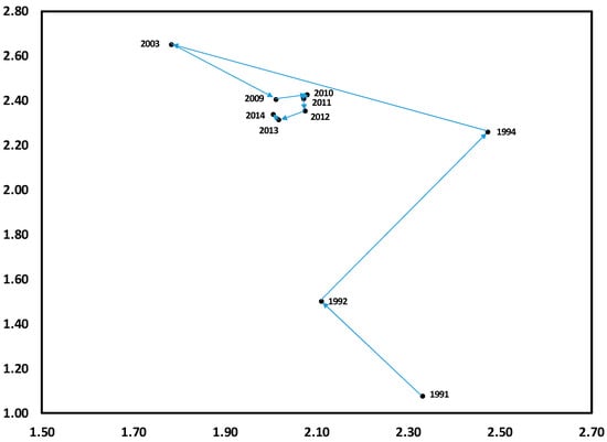 As WS4 is typical of a mature second-growth stand of the central Appalachian region [34], results suggest that, although there is notable inter-annual variability, changes in herb community composition is not unidirectional over time in such stands. For example, although substantial variation occurred in the nine years between 1994 and 2003, far more occurred in the following six years to 2009; indeed, this represented a return toward increased similarity with 1991, despite the 18 year duration of this period (Figure 1). Species variation along this time trend appeared to occur across two gradients. The first of these suggests a fertility gradient, from Vaccinium spp. (VACC), which are well-adapted to weathered, infertile soil [35], to Smilax rotundifolia (SMRO), and then Rubus allegheniensis (RUAL) a nitrophilic species [26,36]. The second is likely a moisture gradient, from seedlings of overstory species (e.g., Quercus rubra, Acer saccharum, A. rubrum) (QURU, ACSA, ACRU) to Laportea canadensis (LACA) and Dryopteris intermedia (DRIN), which are characteristic of moist forest soils [37,38] (Figure 2).