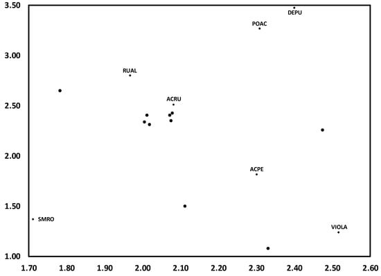 Detrended correspondence analysis (DCA) for herbaceous layer communities from 1991 to 2014 on N-treated WS3. Depicted are prominent species, along with centroids as shown in Figure 3. Species codes are as follows: ACPE (Acer pensylvanicum), ACRU (A. rubrum), DEPU (Dennstaedtia punctilobula), POAC (Polystichum acrostichoides), RUAL (Rubus allegheniensis), SMRO (Smilax rotundifolia), and VIOLA (Viola spp.).