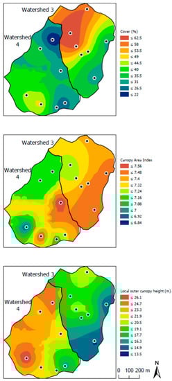 Among the canopy structural variables, canopy area index (CAI) and local outer canopy height (LOCH) appeared to exert the strongest influence on herb cover on WS3. Neither were significantly correlated with cover on WS4, but were negatively (r = −0.88, p < 0.05) and positively (r = 0.88, p < 0.05) correlated, respectively, on WS3. Actual spatial patterns of all three variables on both watersheds were determined via kriging (Figure 5). Because CAI is the sum of surface area density across all levels in a vertical column through the canopy, it should be negatively related to light availability to the forest floor. That is, higher CAI would indicate a greater leaf area intercepting more light. The negative relationship between CAI and cover on WS3 supports this (Figure 5). By contrast, LOCH likely positively related to light availability to the forest floor, being calculated as the maximum surface height in a column, rather than being an indicator of foliar surface area. This is consistent with the positive relationship between LOCH and herb cover on WS3 (Figure 5).