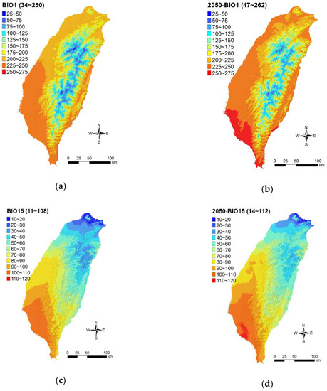 Many researchers have suggested that more attention should be given to the explanatory power and ecological basis for choosing environmental variables [28,31,32], especially those that are physiologically relevant [33]. However, the availability of some physiologically relevant variables was low [34], and thus we used bioclimatic variables as surrogates [35,36]. This study extracted 19 bioclimatic variable layers from the WorldClim database (http://www.worldclim.org) for current and future (2050) environments. These 19 bioclimatic variables (BIO1–BIO19) were derived from monthly temperature and rainfall values to generate more biologically meaningful variables [37]. The future climate scenario for the year 2050 (average for 2041–2060) used the same 19 variables downloaded from the WorldClim database projected by CCSM4 under the RCP4.5 scenario. Figure 2 partially demonstrates the current and future climate layers used as independent variables in SDM.
