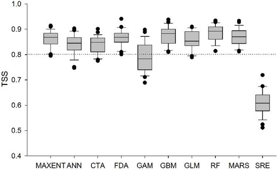 We used the ensemble SDM platform and R package BIOMOD2 [43] to explore the comprehensive spatial pattern of T. aralioides. Figure 4 shows box plots for TSS scores of the 250 models. The most accurate technique was RF and the least accurate was SRE. Although this finding was consistent with those of most studies (e.g., [49]), it differed from those of a few studies (e.g., [50]). An ensemble prediction combining all excellent models may be safer and could overcome uncertainty in model selection [51,52]. Among the 250 models, 210 had TSS > 0.8 or excellent accuracy based on the classification of Ben Rais Lasram et al. [41]. These high-accuracy predictive distribution maps were combined to form ensemble forecasting of T. aralioides, as shown in Figure 5a.