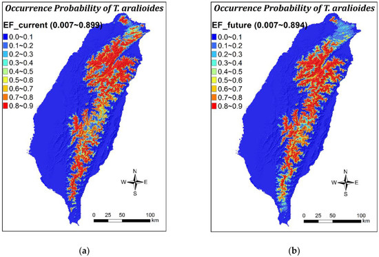 On the whole, the humid mid-altitude forest of central Taiwan was the principal distribution area of T. aralioides, consistent with the description of Flora of Taiwan [7]. The majority of the population was concentrated in the forest edges of the Quercus zone, Chamaecyparis forest, and mixed coniferous and evergreen broad-leaved forest [6,9,53]. However, T. aralioides did not form a pure stand but was scattered and mixed with many coniferous and broad-leaved species. The broad-leaved T. aralioides and coniferous Chamaecyparis formosensis Matsum. are the most representative indicator plants of the cloud forest zone in subtropical Taiwan [6]. Moreover, Figure 5a reveals that another hotspot occurred in the lowlands of northern Taiwan [2,9] or the low-montane warm-temperate rainforest [54]. The lowland position facing the cold and damp northeast monsoon as well as increasing latitude was probably the main cause of downward migration of T. aralioides.