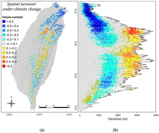 Figure 6b is the side view of Figure 6a with the same color system. Each circle in Figure 6b corresponds to one grid in Figure 6a, and the jagged line in the Figure 6b background is the peak profile of Figure 6a. Figure 6b presents the change in T. aralioides spatial patterns. The warm colors, namely the gain area, in the central mountains indicate upward migration of T. aralioides to nearly ca. 3500 m above sea level. In contrast to Figure 3b, the upper limit of the current T. aralioides distribution was ca. 3000 m above sea level. Temperature rise was considered a critical factor driving mountainous plants to migrate upward [55,56,57].