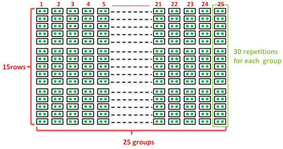 A graphical representation of the experimental site. Corresponding to the 25 treatment groups, there were 25 planting holes along the level trench. Two seedlings were planted in each hole, and 15 rows were in the slope direction. Each treatment group had 30 repetitions.