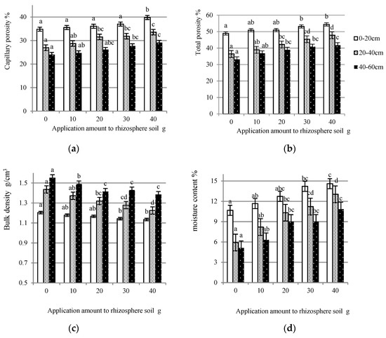As can be seen from Figure 2a, gradual increases in the capillary porosities of the rhizosphere soil occurred with an increasing amount of yeast extract. For soil at a depth of 0–20 cm, the capillary porosity was increased by 4.96% with the application amount of 40 g. There were significant increments in the mean values between the 20 g, 30 g, and 40 g treatments and the yeast-extract-free treatment for soil of the middle layer. The best effect on the soil at the deep layers also resulted under the 40 g treatment, which was increased by 5.12% with a significant difference at the 0.05 level.