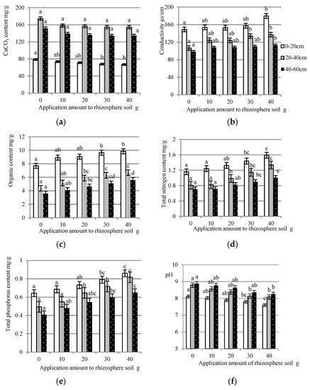 The effect of the application of yeast extract on the chemical properties of rhizosphere soil from the three layers. (a) CaCO3 content of rhizosphere soil to which has been applied different amounts of yeast extract; (b) Conductivities of rhizosphere soil to which has been applied different concentrations of yeast extract; (c) Organic contents of rhizosphere soil to which has been applied different concentrations of yeast extract; (d) Total nitrogen contents of rhizosphere soil to which has been applied different concentrations of yeast extract; (e) Total phosphorus contents of rhizosphere soil to which has been applied different concentrations of yeast extract; and (f) pH of rhizosphere soil to which has been applied different concentrations of yeast extract. In each graph, the bars with the same color and no common letters have a significant difference at the 0.05 level.