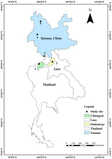 The study sites in the Greater Mekong Subregion (GMS) region. 1: Chiang Rai; 2: Oudomxay; 3: Mengsong; 4: Baoshan; 5: Zhongdian.
