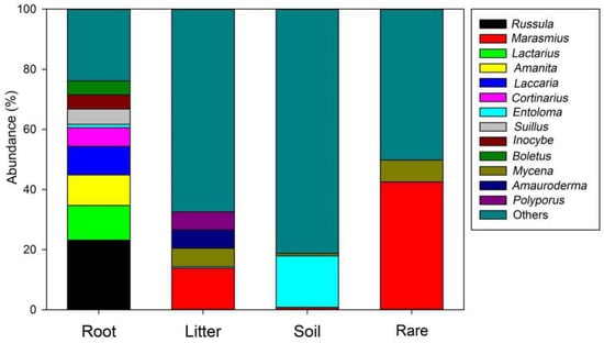 Relative abundances of dominant macrofungal genera collected in the GMS (Zhongdian, Baoshan, Mengsong, Thailand, and Laos) for each substrate category (root, litter, soil, and rare).