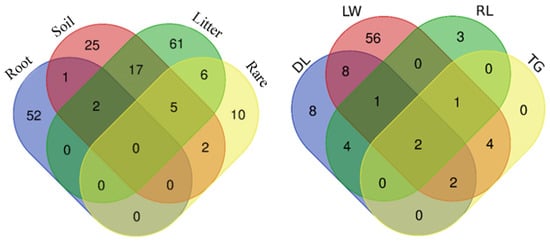 Venn analysis of substrate utilization of each macrofungal genera collected in the GMS by (A) substrate category and (B) substrate subgroup in the category of litter. Each substrate is represented by a single color with the number of genera present in each, while the number in overlapping colors represents the count of macrofungi present in the multiple substrates whose colors overlap there. For help with substrate subgroup identification, see Table S1.