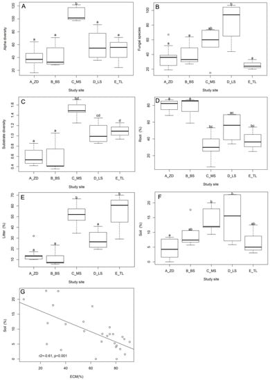 We identified 14 different substrate types, and we calculated the macrofungi-substrate utilization diversity using data from individuals in each substrate in order to evaluate the differences between functional diversity and taxonomic diversity. To avoid any significant confounding effects from vegetation type when testing the correlation, we only considered our data from secondary forests, which was the dominant vegetation type across the GMS. The Fisher’s alpha diversity and the species richness index were calculated for the macrofungi and the substrate in each study plot [32,33,34]. The proportion of each substrate relative to all other substrates in the study site was calculated for each study site. The Kruskal–Wallis rank sum test was used to test for differences in macrofungal diversity, substrate diversity, root (%), litter (%), and soil (%) between different study sites. The relationship between soil saprophytic fungi and ECM fungi was analyzed using Spearman’s correlation test [35], and the linear relationship was plotted. RStudio-0.99.902 was used for the statistical analysis and to create the figures (https://www.rstudio.com/) [36].