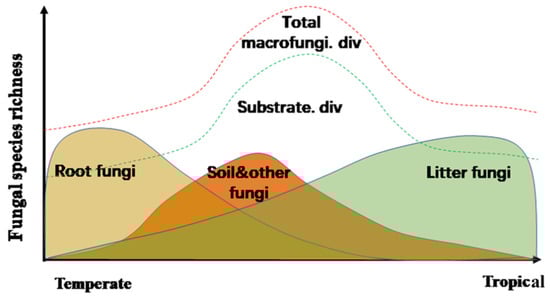 Conceptual diagram of the distribution patterns of substrate-specific fungi in secondary forests across latitudinal gradients. We compared substrate diversity with total fungal taxonomic diversity. The x-axis represents climate zones ranging from the temperate to the tropical zone. The y-axis represents macrofungal species richness. Our survey indicated that macrofungi that colonized the soil, the litter, and the root showed geologically-separated distribution patterns. Litter fungi dominated in the tropics, whereas root fungi dominated in temperate zones. Macrofungi living on soil and rare substrates were mainly found in subtropical areas near the tropics, where there was also higher macrofungal taxonomic diversity (total macrofungi. div) and substrate utilization diversity (substrate. div).
