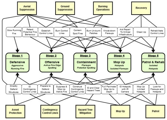 Figure 1 is a conceptual map of suppression resulting from our analysis of the charted stages and activities. Our iterative qualitative analysis of ten large wildfires revealed the considerable complexity of suppression effort. Overall, we identified and delineated 20 distinct suppression tasks (white boxes, Figure 1). Detailed descriptions of each task are given in Appendix B. While the five stages are explained in detail in the next section, key aspects that delineate the stages are: