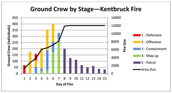 The sector level assessment by stage yields a drastically different picture of resource use than what is assumed by the current conceptual model of suppression, illustrated by SSMs. This model of suppression and the related productivity research assumes that the focus of resource use is establishing control/contingency lines, which relates to only two (establish control lines, construct contingency control lines) of the 12 tasks we identified in stage 2 and 3. Currently, there are no measures of resource requirements or estimates of productivity for the other 10 tasks in these two stages, nor for any tasks in stages 1, 4 and 5. We quantified this shortfall with the daily sector level assessment of stages, which we illustrate with a graph using the number of daily ground crews as a proxy for resource use on a single wildfire (Figure 2; graphs of all ten wildfires are in Appendix C). Other than command staff, equipment operators and pilots, the ground crew figure includes all fireline personnel. Only 45% of resource use falls within stages 2 and 3 (43% for all 10 wildfires). The magnitude of this shortfall is masked by DELWPs-reported whole-fire containment status, which boosts ‘containment’ resource use to 71%, which is the percentage of resources used until the wildfire was ‘contained’—according to DELWP, equivalent to stage 3—at the end of the 7th day of the fire []. The current dataset does not permit the attribution of resource use at the individual task level; however, with the sector level stage assessment, we estimated that at least 57% of resource use on our sample of 10 large wildfires falls outside of current suppression modelling and productivity research. Sectors of large wildfires commonly differ on the stage of suppression attained on any given day, which provides empirical support to the overlapping phases of suppression described in Figure 1 of Plucinski []. The sector-based assessment of fire status along with an explicit knowledge of stage-based suppression tasks gives a comprehensive insight into the complexity of large fire suppression. Such an understanding should be the starting point for resource planning, productivity estimates, and fire suppression modelling.