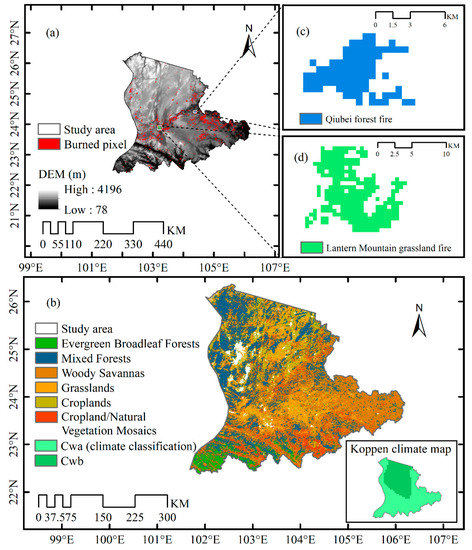 (a) Study area showing the historical (2007–2016) burned areas extracted from MCD64A1 Burned Area product and the DEM (Digital Elevation Model) as the background image. (b) Dominated vegetation types and Koppen climate classification. The location and burned pixels of (c) the Qiubei forest fire event on the 1st February 2010, and (d) Lantern Mountain grassland fire event on the 13th February 2016. Cwa: Subtropical Highland Zone; Cwb: Humid Subtropical Zone.