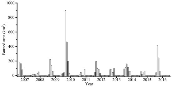 The MODIS Burned Area (BA) product MCD64A1 Collection 6 [40] was proven to be of high accuracy and large-scale BA product [47] was selected as the measure of fire occurrence in this study. The product is generated monthly at a spatial resolution of 500 m. All pixels with values greater than zero in the “Burn Date” layer were identified as burned pixels and were used to determine the burn locations and burn dates in the study area.