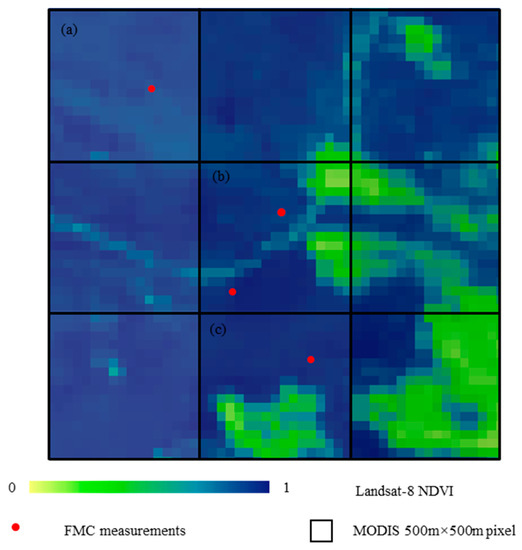 A case showing the spatial location of field plot, Landsat 8 OLI pixel and MODIS pixel. The black boxes indicate the 3 × 3 MODIS grid (1.5 km × 1.5 km). (a) homogeneous and (c) heterogeneous LFMC measurement plots of vegetation at MODIS spatial resolution and (b) an example of a MODIS pixel containing multiple LFMC measurement plots, and 152 field data were finally obtained after calculating the average value of the field LFMC measurements in such a case.