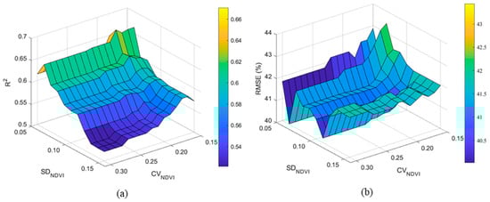 Three-dimensional maps showing R2 (a) and RMSE (b) between LFMC observations and estimations with the variation of the threshold values of CVNDVI and SDNDVI used to filter out sites that are heterogeneous within the MODIS footprint.
