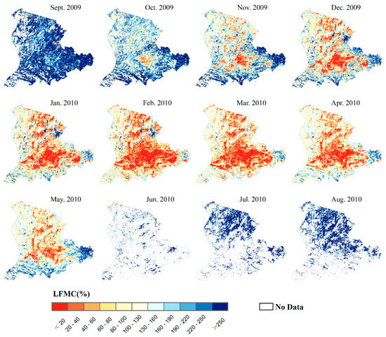 Multi-temporal mapping of monthly LFMC over southwest China throughout the 2009/2010 fire season.