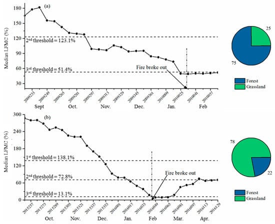 In this study, cumulative burned area methodology was applied to identify breakpoints, and thus to determine the thresholds in forest and grassland classes across Cwa and Cwb climatic regions. Pimont et al. [56] suggested that this kind of methodology should be considered with caution because it is biased by the frequency distribution of LFMC values. However, we argue that the LFMC threshold is not only affected by the distribution of pre-fire LFMC but also by the corresponding burned area. For example, we found that in low LFMC condition (under 15%, Figure 6b,d), cumulative burned area significantly increases, mainly because of the occurrence of several fire events with a large burned area. Therefore, it is reasonable to use this methodology to find LFMC thresholds values below which fires are prone to break out and burn large areas. On the other hand, Pimont et al. [56] also found that fire activity saturated at low LFMC values when cumulative burned area methodology was applied. For example, the cumulative burned area basically did not increase when LFMC was lower than 37.2% (Figure 6c). However, this saturation does not suggest that a low LFMC corresponds to a low fire occurrence. It suggests that it is enough to support fire when the LFMC condition is slightly higher than 37.2%. Therefore, a higher LFMC threshold of 54.4% (Figure 6c) was considered.