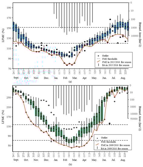 The dynamics variation of the median grassland (Figure 8b) and forest (Figure 8a) LFMC across the study area are similar in terms of alignment with the fire season (see Section 2.1). The lowest LFMC were observed from DOY 337 to DOY 113 which coincided with the dry season and the months with the highest fire occurrence (Figure 8). Additionally, the median LFMC for grassland and forest of the study area (red lines) reached the critical LFMC thresholds (dotted lines) earlier during the highest fire activity fire seasons (2009/2010 and 2015/2016) than for the whole time period (shown as boxplots). Moreover, the median LFMC values during these two fire seasons were almost lower than the first quartile value of the boxplot on the same DOY and were much more likely to be observed as the low outliers (dots traversed by the red line). For example, 14 and 21 median LFMC values were observed as the outliers in the 2015/2016 (Figure 8a) and 2009/2010 (Figure 8b) fire seasons, respectively. Furthermore, the period of lower LFMC coincided with the larger burned area (Figure 8). This suggests that the critical LFMC thresholds effectively explain the burned area. For example, almost all grassland fires in 2009/2010 occurred when the regional median LFMC was below the 70.9% threshold (Figure 8b).