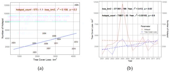(a) Relationship between annual number of hotspots and tree cover loss in Riau Province; (b) Annual tree cover loss (blue lines, left axis) and number of fire hotspots (red lines, right axis) in Riau. The solid lines represent actual number and the dashed lines show the estimated linear trend lines. The equation of the best fit line and the correlation coefficient (r2) is shown.