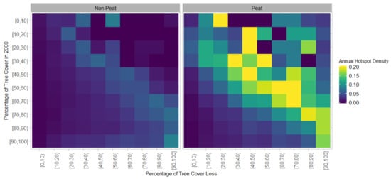 Annual hotspot density (km−2 year−1) as a function of percentage of tree cover loss (2000 to 2012) and percentage tree cover in the year 2000. Results are shown separately for non-peat and peat regions.