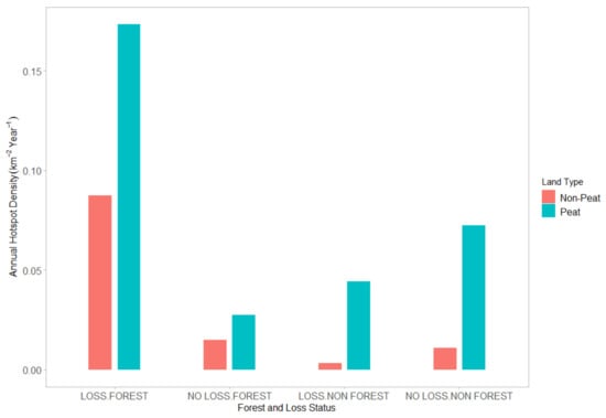 Figure 4 shows these results separately for peat and non-peat areas. Peatland areas experienced higher hotspot density than non-peat areas in all forest and loss status categories. In forested peatland areas, regions with tree cover loss experienced 8 times more fire hotspots that regions without tree cover loss.