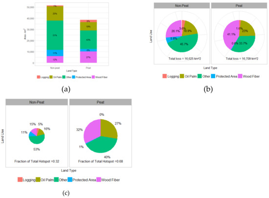 To explore relationships between fire hotspots and tree cover loss, we analyzed the fire dynamics based on both land-use and land type (peatland or non-peatland). Figure 5a shows the area of each land-use type in Riau, separately shown for peatland and non-peatland areas. Non-peatland areas are dominated by “other” (51%) and oil palm (25%), whereas peatlands are dominated by “other” (43%), wood fiber (27%) and oil palm (19%). In both peatlands and non-peatlands, the smallest areas was taken by logging concessions.