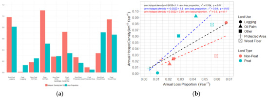 Comparison of forest loss rates and hotspot density across different land-uses. (a) Proportional forest loss (green) and hotspot density (red, km−2); (b) Correlation between annual proportional forest loss and annual hotspot density. Dashed lines show regression lines for peat (blue), non-peat (red) and both (black).