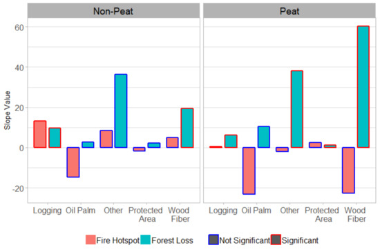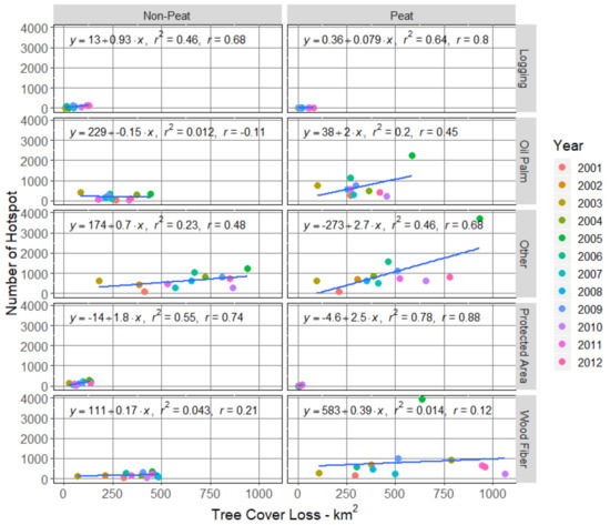 Figure 7 shows the relationship between annual forest loss and number of hotspots within each land-use type. Relationships between annual forest loss and annual number of hotspots are generally positive. Logging concessions and protected areas exhibit strong correlations (r2 > 0.45) between annual forest loss and fire in both peat and non-peat areas. In contrast, relationships in wood fiber and oil palm concessions are weak (r2 < 0.2) in both peat and non-peat areas. Across all land-use types, correlations are stronger in peatland compared to non-peatland areas.