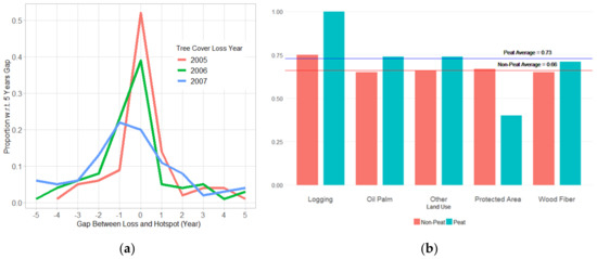 Figure 9 shows the time difference between the year of tree cover loss and the year with maximum number of hotspots. We restrict this analysis to tree cover loss occurring during 2005 to 2007, which are the central years in our datasets and allow for an equal number of years before and after any tree cover loss. Across all of Riau, the year with the maximum number of fire hotspots occurred within one year of the year tree cover loss in 70% of 1 km2 cells. That indicates that in these regions, tree cover loss and fire are closely linked. In 17% of cells, the year with the maximum number of fire hotspots occurred 2 to 5 years before tree cover loss, whilst in 14% of cells, the maximum number of fire hotspots occurs between two and five years after the year of forest loss. Figure 9b shows the fraction of cells in which the year with maximum number of hotspots occurred within one year of tree cover loss. In peat lands, hotspots occurs in the same year as tree cover loss in 73% of cells, compared to 66% in non-peatlands. It was estimated that 25% of forest loss in Indonesia involved fire (co-located fire occurred in the same year or the year before forest loss) [50].
