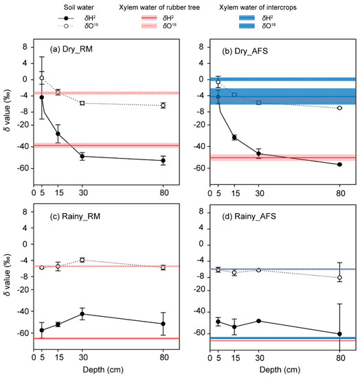 The δ2H and δ18O values of the consumers (i.e., the xylem water of rubber trees and intercrops) and their water sources (i.e., soil water within four different depths) at each site during the extremely dry season (a,b) and the pronounced rainy season (c,d). The bold lines inside of the shaded bars indicate mean values, and the width of the shaded bar indicates the SD. All data are expressed as the mean ± SD. “Dry_RM” and “Dry_AFS” indicate the rubber monoculture (RM) and the rubber tree and sharp-leaf galangal agroforestry system (RS-AFS) in the extremely dry season, respectively. Similarly, “Rainy_RM” and “Rainy_AFS” respectively indicate those two sites in the pronounced rainy season.