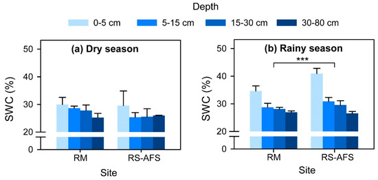 Soil water content (SWC) within the soil profiles at each site during (a) the dry season and (b) the rainy season. “RM” and “RS-AFS” indicate the rubber monoculture and the rubber tree and sharp-leaf galangal agroforestry system, respectively. Data are expressed as the mean ± SD. * p < 0.05, ** p < 0.01, *** p < 0.001.
