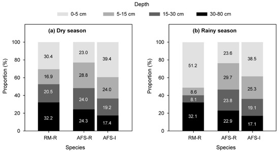 Mean water-absorbing proportion of each plant species in (a) the extremely dry season and (b) the pronounced rainy season. “RM-R” indicates rubber trees in the rubber monoculture. “AFS-R” and “AFS-I” indicate rubber trees and intercrops in the agroforestry system, respectively.