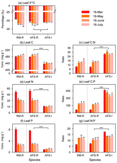 Furthermore, the leaf δ13C of the rubber tree was significantly correlated with the leaf nutrient concentration and leaf nutrient ratio in the RM (Figure 5a), but the correlation coefficients declined, and the significant correlations with leaf C, leaf C/P, and leaf N/P disappeared in the RS-AFS (Figure 5b). Like the rubber trees in the RS-AFS, the leaf δ13C of the intercrops was also significantly correlated with leaf N and P (Figure 5c). Except for leaf C, all leaf parameters of the rubber trees in the RM were significantly similar to those of rubber trees in the RS-AFS (Figure 6). However, in the RS-AFS, no significant similarity between the rubber trees and the intercropped sharp-leaf galangals was found in their leaf δ13C, leaf C and N, and leaf C/N (Figure 6a–c,e), but their leaf P concentrations and leaf C/P and N/P exhibited significant but opposite variations (Figure 6d,f,g).