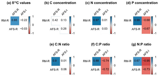 The Pearson correlation-based similarities between RM-R, AFS-R, and AFS-I, which were analyzed through the (a) leaf δ13C values; (b‒d) leaf C, N, and P concentrations; and (e‒g) leaf C/N, C/P, and N/P ratios of the rubber trees and their intercrops. The color indicates the sign of the correlation (blue indicates a positive correlation, and red indicates a negative correlation). All the correlation coefficients in the red and blue boxes were significant (p < 0.05).