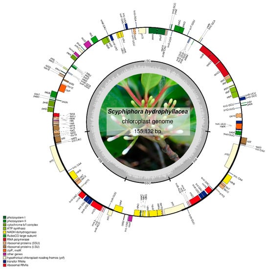 Scyphiphora hydrophyllacea is a shrub mangrove that belongs to the Scyphiphora genus (family: Rubiaceae), a monotypic genus whose distribution range extends south India and as well as Ceylon, Indochina, and Hainan in China through the Malay Archipelago and Philippines to Australia and New Caledonia and northward to the Solomon Islands and Palau []. Its distinguishing characteristics include rounded glossy leaves, fringed stipules, small white flowers, and eight-ribbed drupe-like fruits. Its terminal nodes and shoots are also distinctively covered by a resinous substance []. This species is often located along the high intertidal zones of the midestuarine reaches where it grows in pockets of scattered isolated shrubs and is often regarded as a minor constituent of the mangrove habitat. Based on the categories and criteria of the International Union for the Conservation of Nature Red List of Threatened Species, S. hydrophyllacea has been classified into the Least Concern category, which has a global loss of 20% []. In China, this species is found only in Hainan Island, and it has been included in a list of key wild plants under provincial protection in Hainan (2006). Although the incidences of fruit set in this mangrove is high, only a low percentage of seed germination has been reported []. Today, S. hydrophyllacea continues to be regarded as an important medical plant because of its medical properties such as antihepatocarcinogenic and antioxidant effects []. Several phytochemicals including flavonoids, terpinoids, and iriddoids have been reported in this species []. However, so far, no studies have been conducted to investigate its genetic background. The chloroplast (cp) genome of S. hydrophyllacea reported in this paper provides valuable information for further studies of the cp molecular biology of the species. These data will also promote work on genetic breeding and germplasm protective research, and are projected to help clarify the molecular evolution status of S. hydrophyllacea in Rubiaceae.