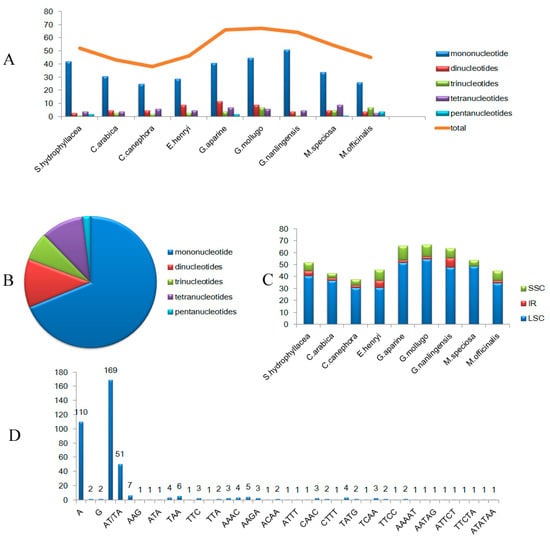 SSRs are accepted as important molecular markers for population variation studies in higher plants and are usually composed of 1–6 nt []. SSRs in the cp genome, similar to those in the nuclear genomes, are highly variable and are often used as genetic markers []. In this study, nine cp genome sequences of Rubiaceae plants (including S. hydrophyllacea) were used to determine SSR loci using MISA software (Figure 2). A total of 52 microsatellites were identified in the S. hydrophyllacea cp genome (Figure 2A, Figure S1, Table S1). Moreover, 43, 38, 46, 66, 67, 64, 54, and 45 SSRs were detected in C. arabica, C. canephora, E. henryi, G. aparine, G. mollugo, G. nanlingensis, M. speciosa, and M. officinalis, respectively (Figure 2A, Table S1). G. aparine (66 SSRs), G. mollugo (67 SSRs), and C. canephora (38 SSRs) have the highest and lowest number of SSRs, respectively. All SSRs were classified into five types of microsatellites: Mononucleotide, dinucleotide, trinucleotide, tetranucleotide, and pentanucleotide (Figure 2A,B). Consistent with previous reports, most of the SSRs are mononucleotide repeats []. In agreement with previous research, the number of mononucleotide repeats is more than the sum of other types (Figure 2B), and all mononucleotide repeats consist of A or T bases, which is analogous to other land plants []. As for the SSR loci, the repeats located in the LSC region are more frequent compared with those in the SSC region and IR regions in all the analyzed Rubiaceae plants (Figure 2C). The frequency of identified SSR motifs in different repeat class types of these nine species are listed in Figure 2D. Mononucleotide A/T showed the highest frequency in all repeats.