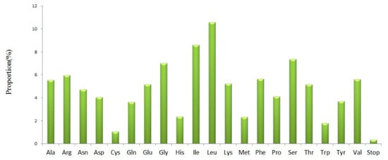 In this study, the codon usage frequency and the relative synonymous codon usage (RSCU) in the S. hydrophyllacea plastome were analyzed. All protein-coding genes presented a total of 68,907 bp and 22,969 codons in the S. hydrophyllacea cp genome. Among all the codons, leucine (Leu) was the most abundant amino acid with a frequency of 10.58%, followed by isoleucine (Ile) with a frequency of 8.61%, whereas cysteine (Cys) was less abundant with a frequency of 1.06% (Figure 3, Table S2 and S3). Leucine and isoleucine are among the more common codons in comparison with other previously reported land plant cp genomes [,]. All 19 A/U-ending codons had an RSCU value of >1, whereas two amino acids, methionine (Met) and tryptophan (Trp), with C/G-ending codons had RSCU values of <1 and showed no codon bias. The results for the number of codons (Nc) of each protein-coding gene ranged from 28.65% (petN gene) to 61.00% (PetG) (Table S3). The condon usage bias of the cp genome may be caused by selection and mutation []; meanwhile, a better understanding of exogenous gene expression and molecular evolution mechanisms of S. hydrophyllacea can be gained from further research on codons.