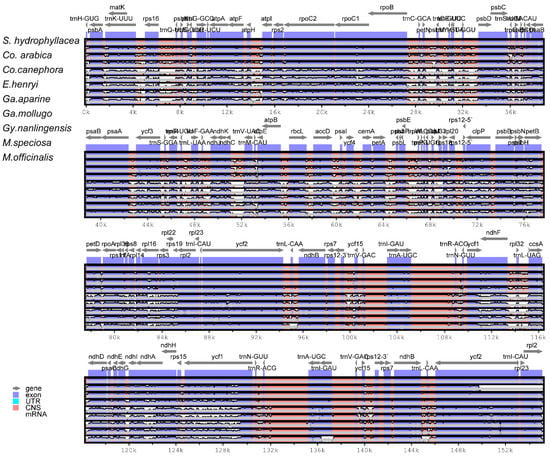 Sequence alignment of nine Rubiaceae species chloroplast genomes, with S. hydrophyllacea as the reference. The y-axis indicates the percent of identity between 50% and 100%. Genome regions are color-coded as protein-coding regions, rRNA coding regions, tRNA coding regions, and conserved noncoding sequences.