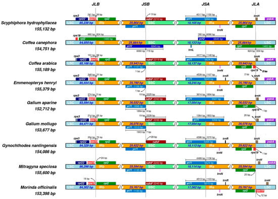 IR contraction/expansion analysis of nine Rubiaceae species. JLB (LSC /IRb), JSB (IRb/SSC), JSA (SSC/IRa), and JLA (IRa/LSC) denote the junction sites between each of the corresponding two regions on the genome.